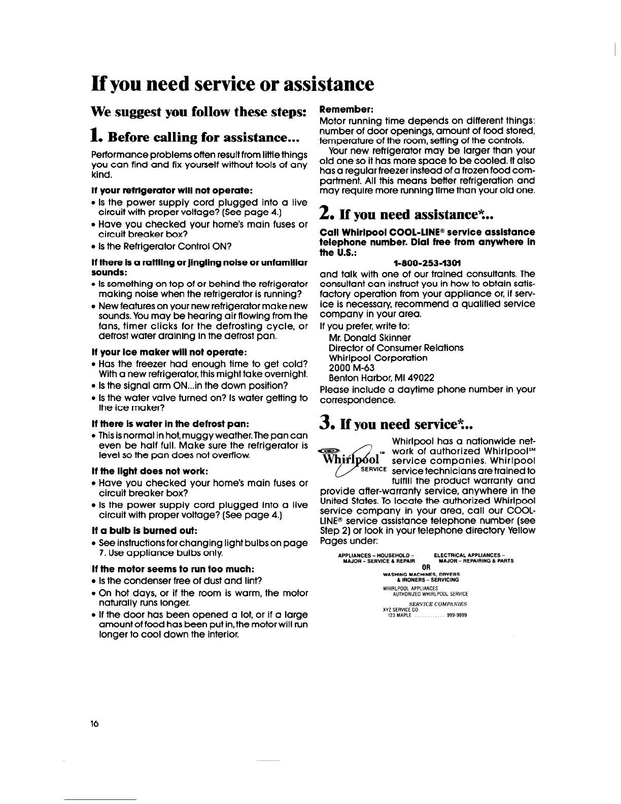 Call Whirlpool COOL-LINE@ service assistance