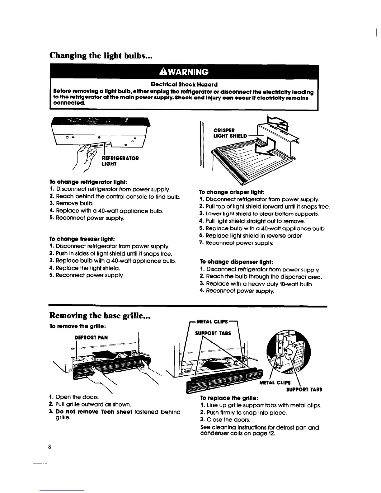 Before removing a ilght bulb, elther unplug the refrigerator or disconnect the electricity leading