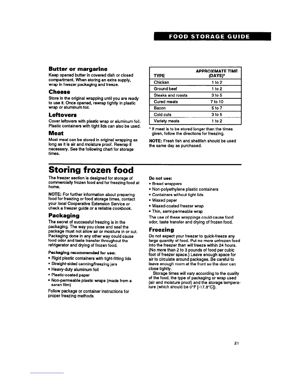 food for freezing or food storage times, contact