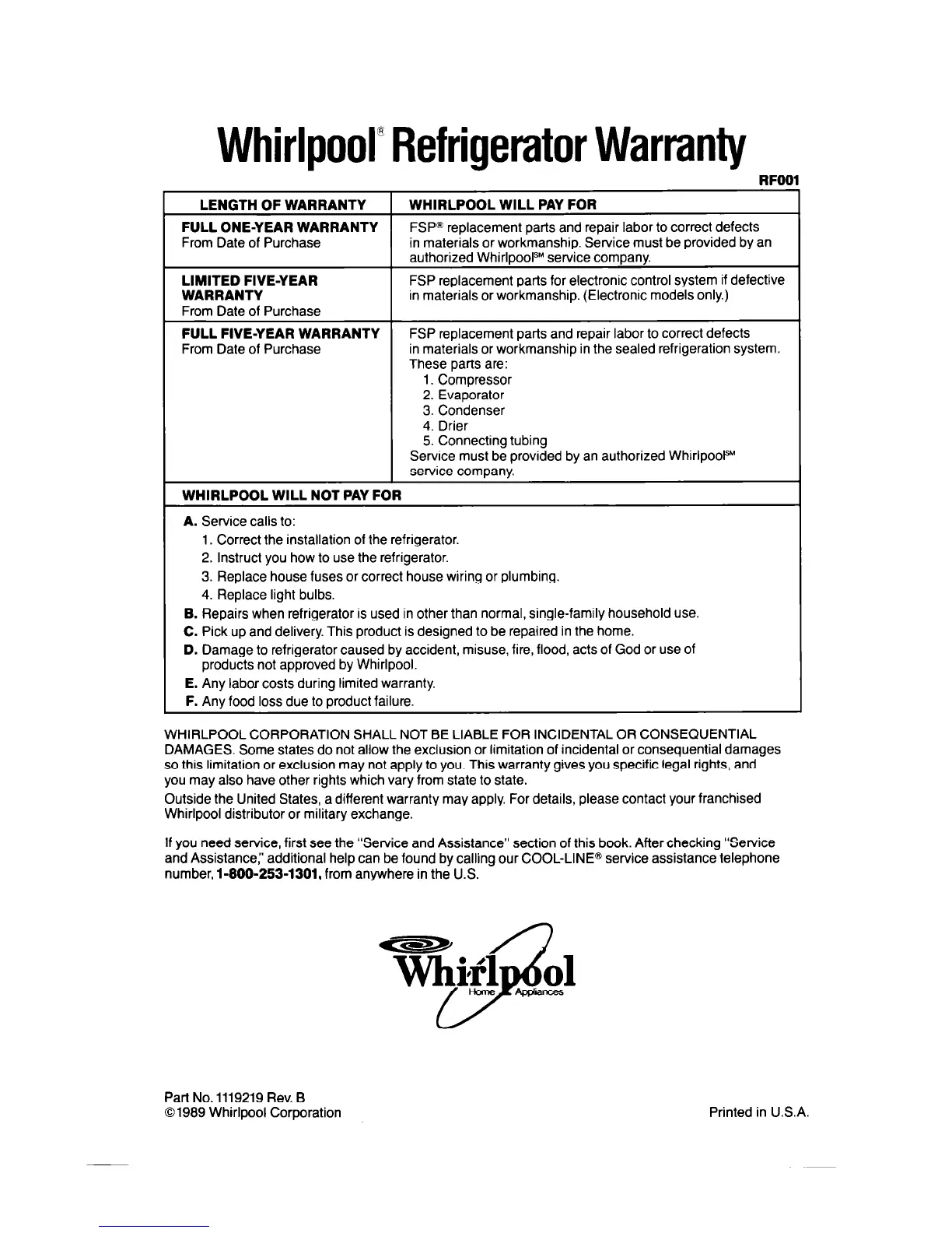 WHIRLPOOL CORPORATION SHALL NOT BE LIABLE FOR INCIDENTAL OR CONSEQUENTIAL