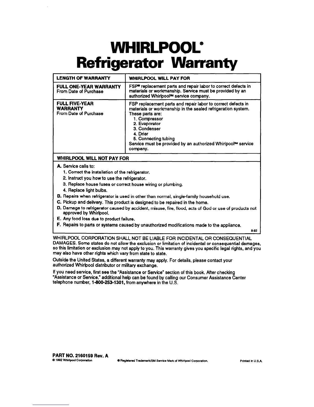 WHIRLPOOL CORPORATION SHALL NOT BE LIABLE FOR INCIDENTAL OR CONSEQUENTIAL