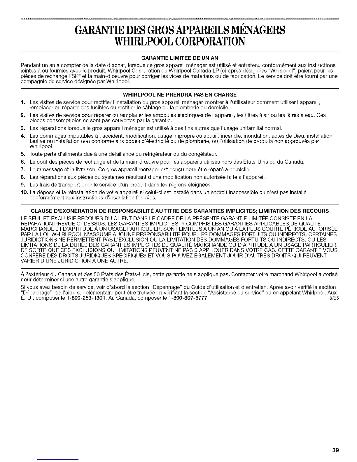 /_,I'exterieur du Canada et des 50 €tats des 12tats-Unis, cette garantie ne s'applique pas. Contacter votre marchand Whirlpool autorise