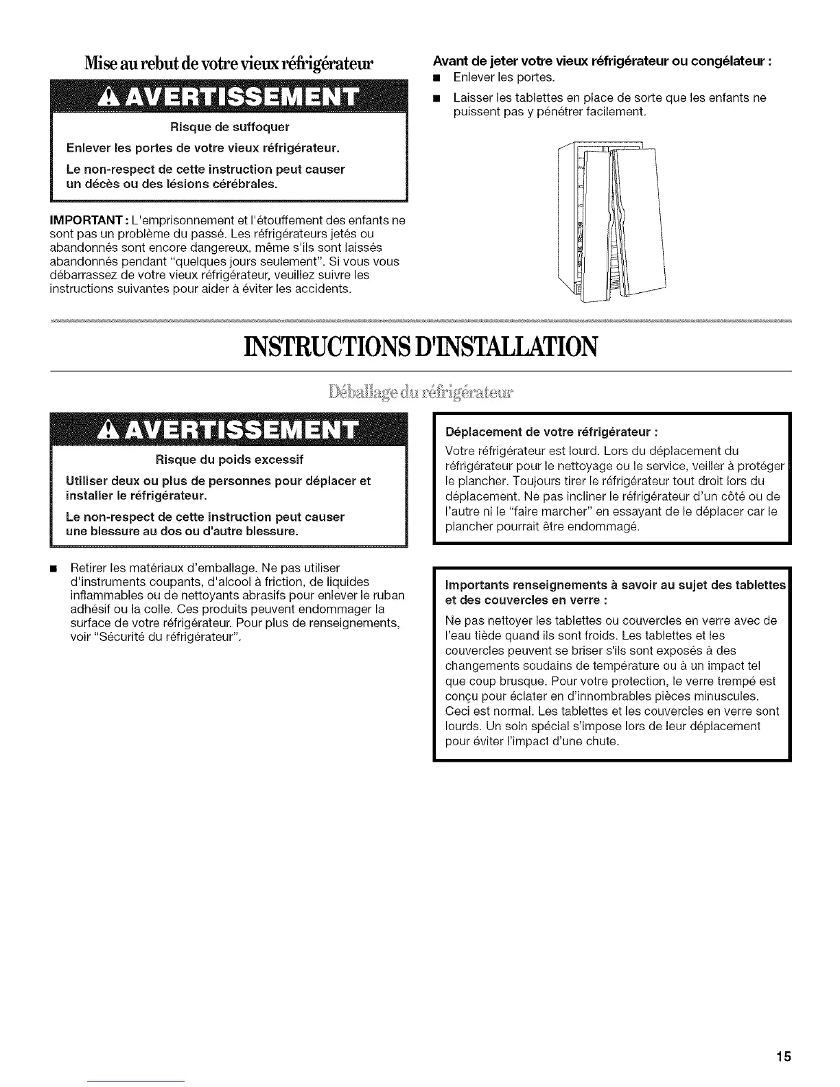 deplacement. Ne pas incliner le refrigerateur d'un c6te ou de