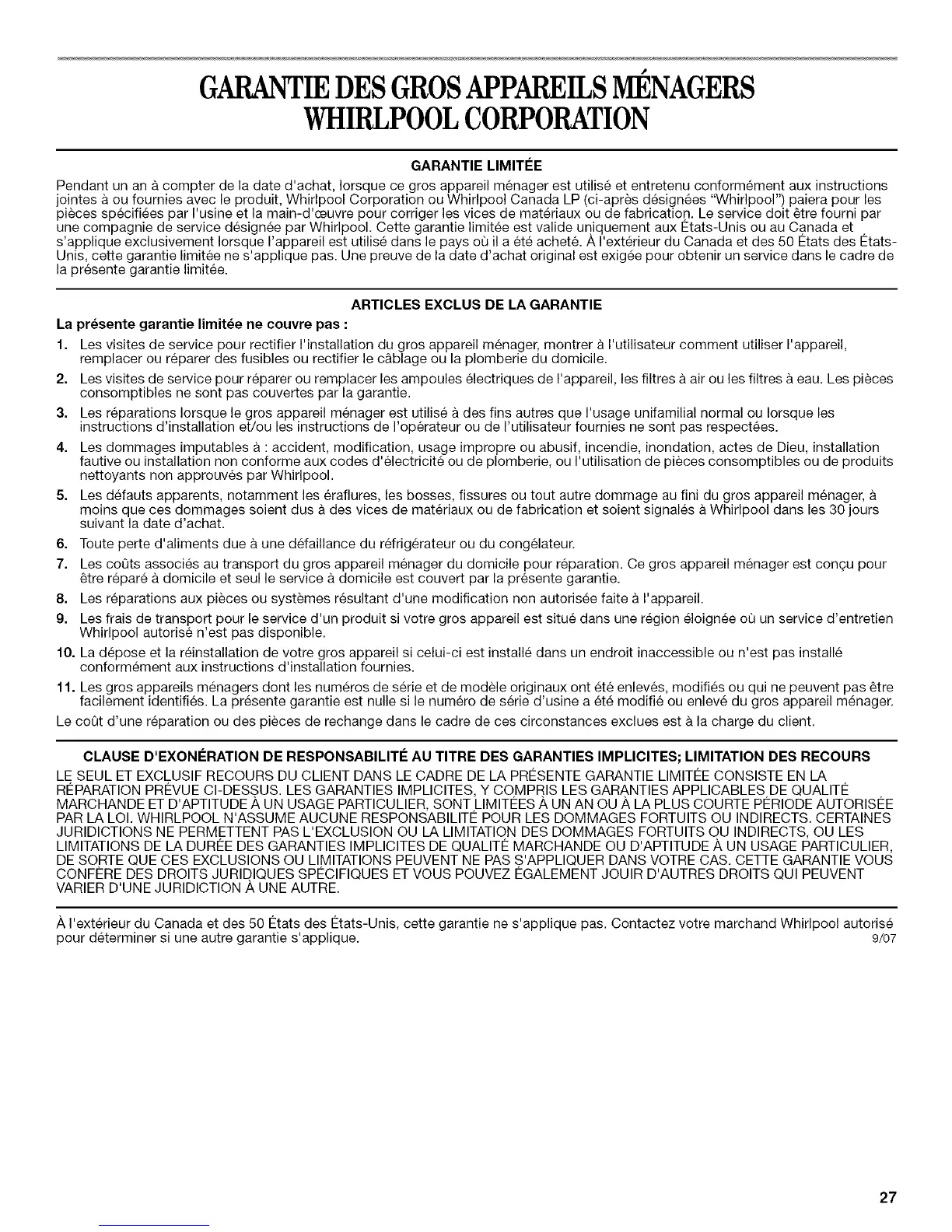 /_,I'exterieur du Canada et des 50 12tats des 12tats-Unis, cette garantie ne s'applique pas. Contactez votre marchand Whirlpool autorise