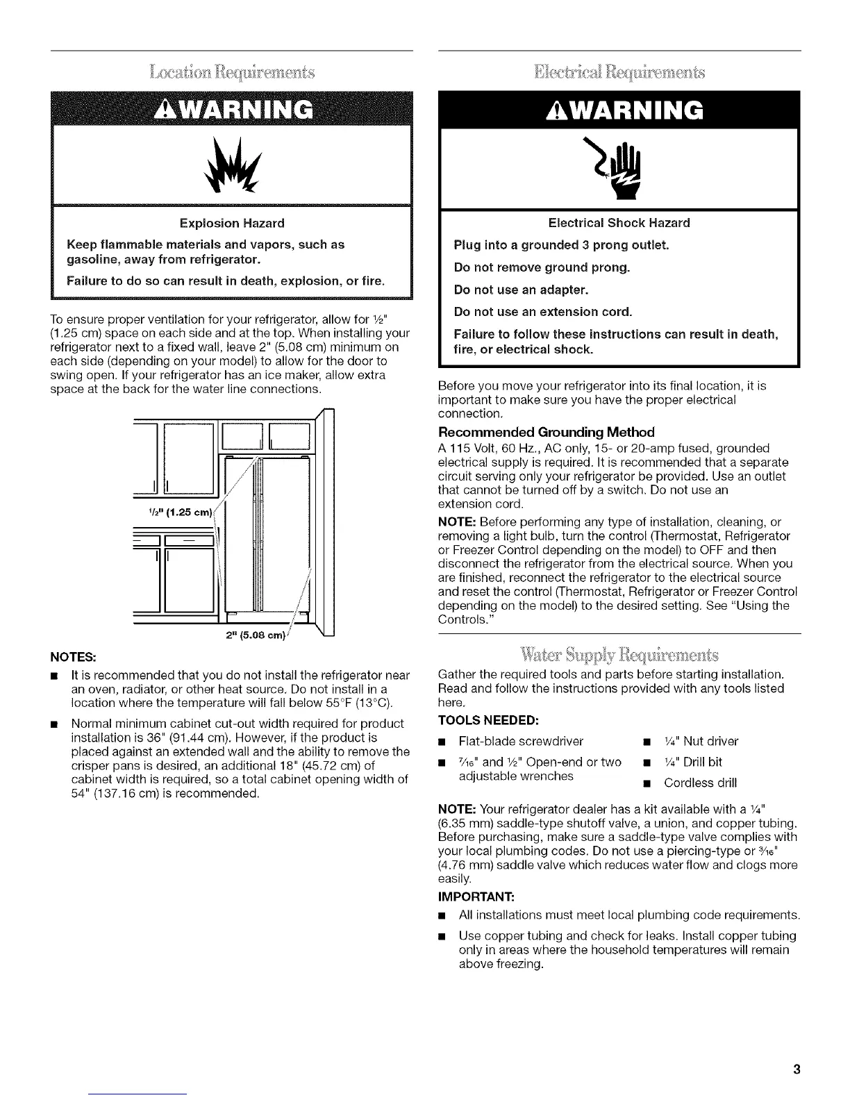 refrigerator next to a fixed wall, leave 2" (5.08 cm) minimum on
