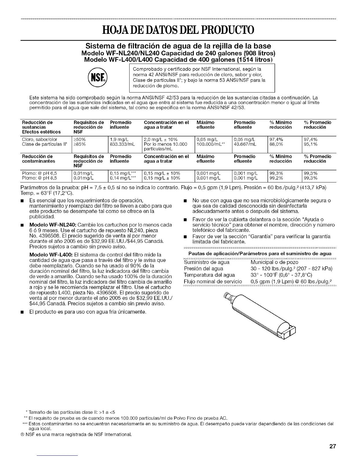 Este sistema ha sido comprobado segOn la norma ANSI/NSF 42/53 para la reducci6n de las sustancias citadas a continuaci6n. La