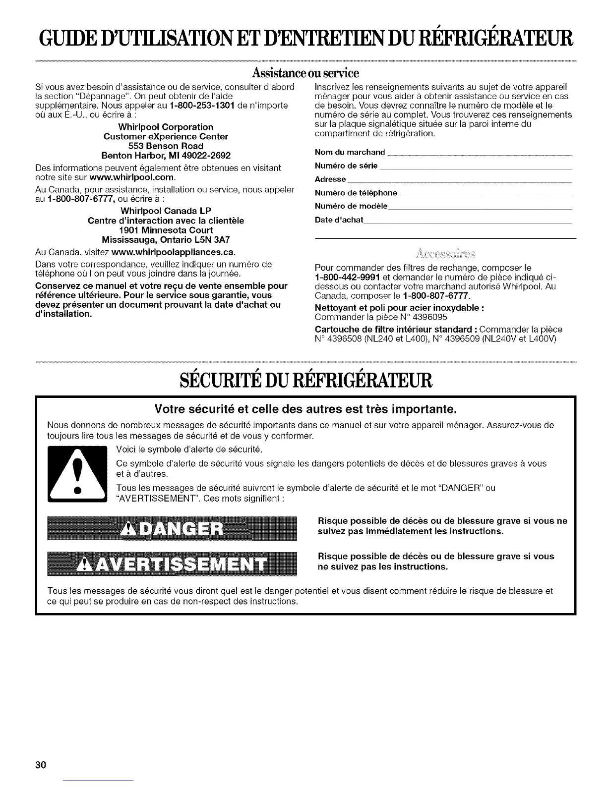 dessous ou contacter votre marchand autorise Whirlpool. Au