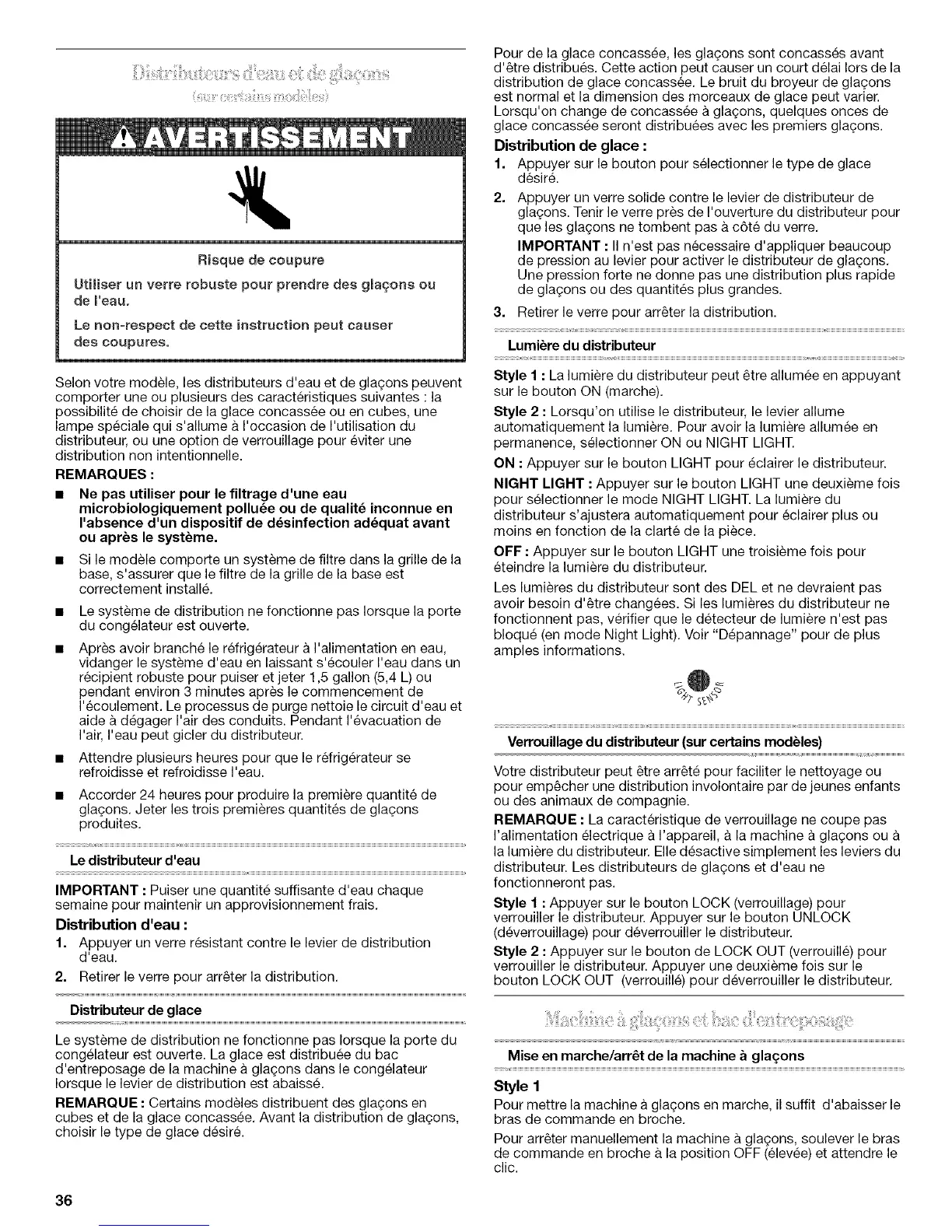 distributeur. Les distributeurs de gla9ons et d'eau ne
