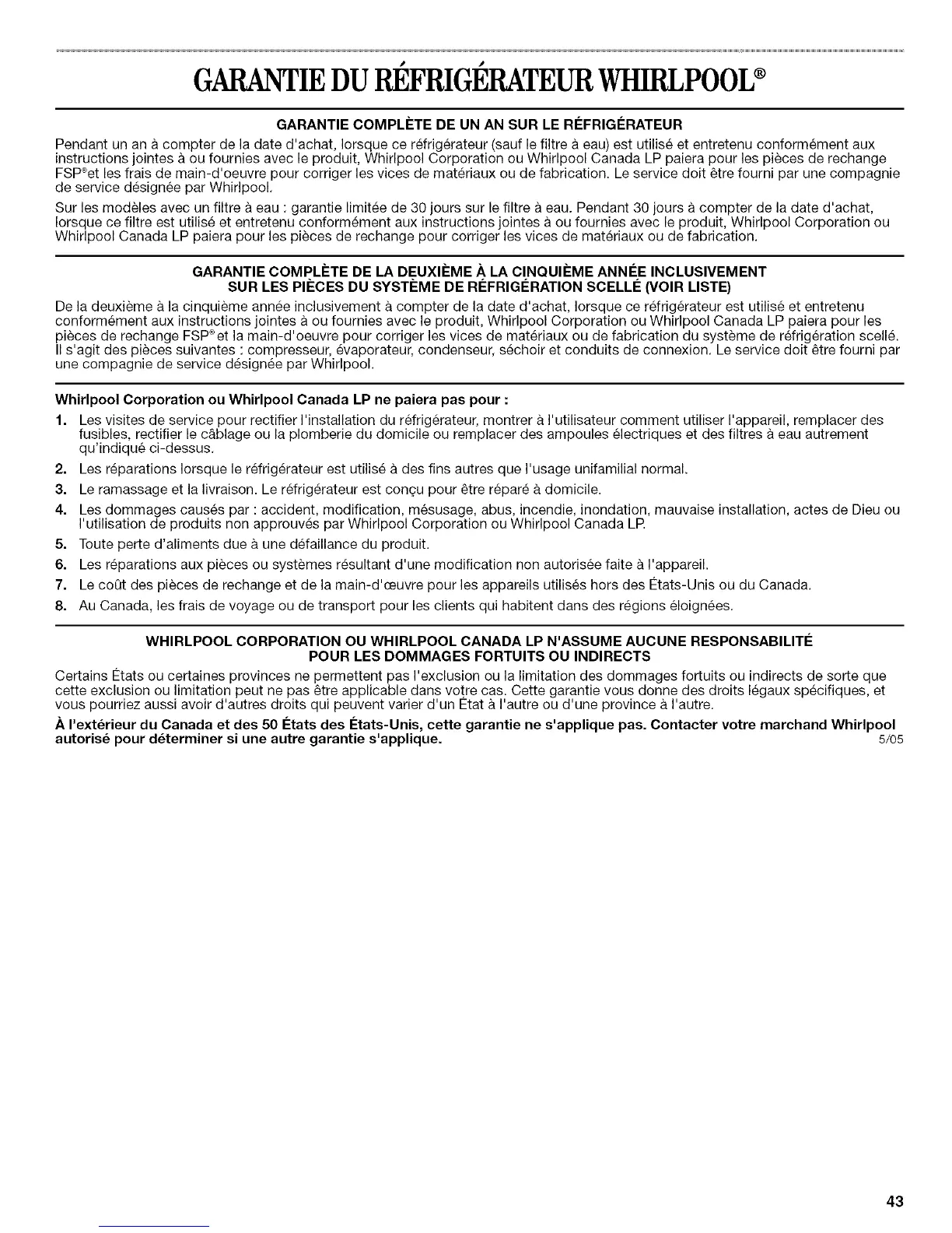 A I'exterieur du Canada et des 50 I_tats des I_tats-Unis, cette garantie ne s'applique pas. Contacter votre marchand Whirlpool