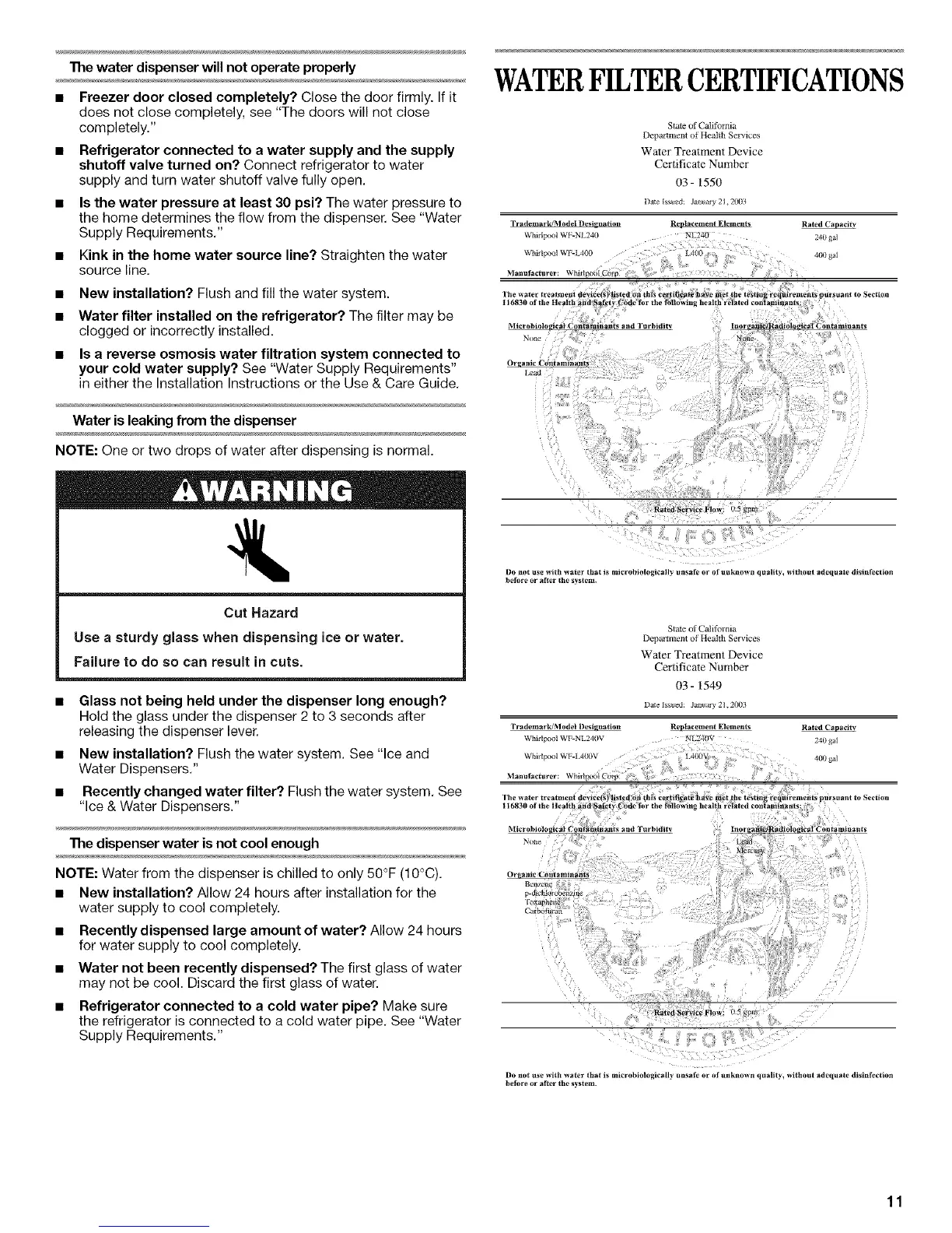 NOTE: Water from the dispenser is chilled to only 50°F (10°C).
