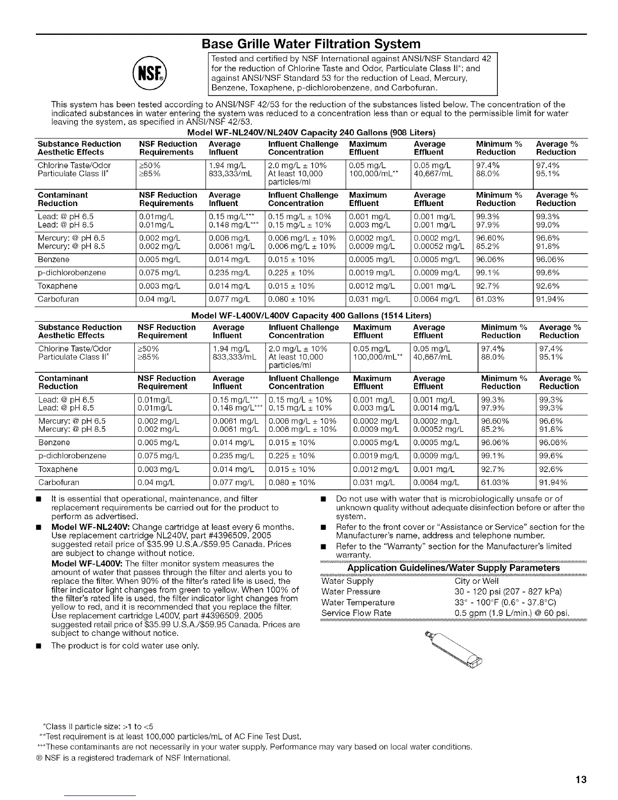 Model WF-NL240V: Change cartridge at least every 6 months. • Refer to the front cover or "Assistance or Service" section for the
