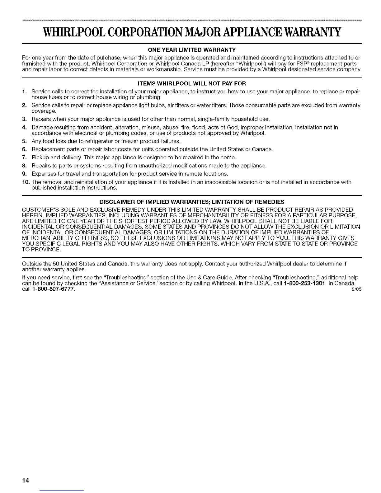 can be found by checking the "Assistance or Service" section or by calling Whirlpool. In the U.S.A., call 1-800-253-1301. In Canada,