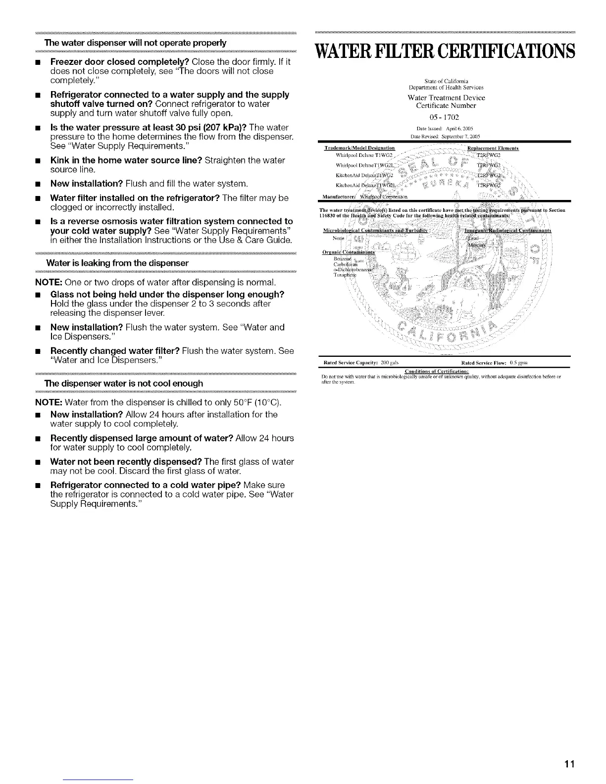 NOTE: Water from the dispenser is chilled to only 50°F (10°C).