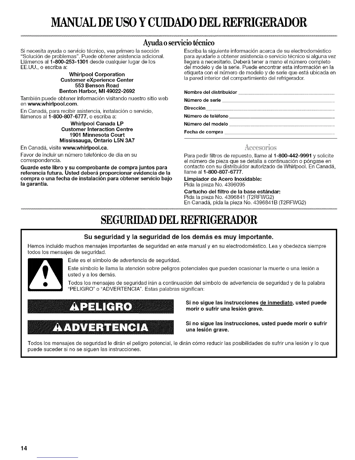 contacto con su distribuidor autorizado de Whirlpool, En CanadA,