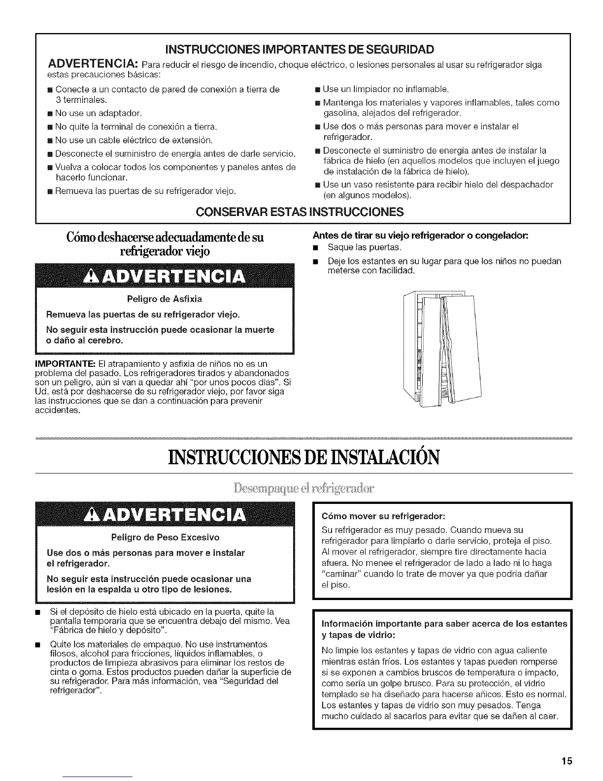 ADVERTENCIA: Para reducir el riesgo de incendio, choque electrico, o lesiones personales al usar su refrigerador siga
