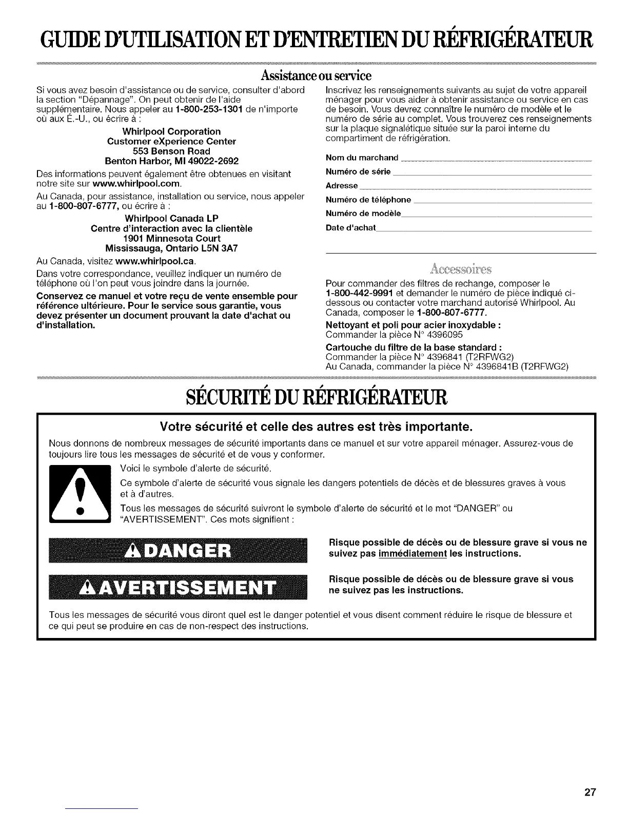 dessous ou contacter votre marchand autorise Whirlpool. Au