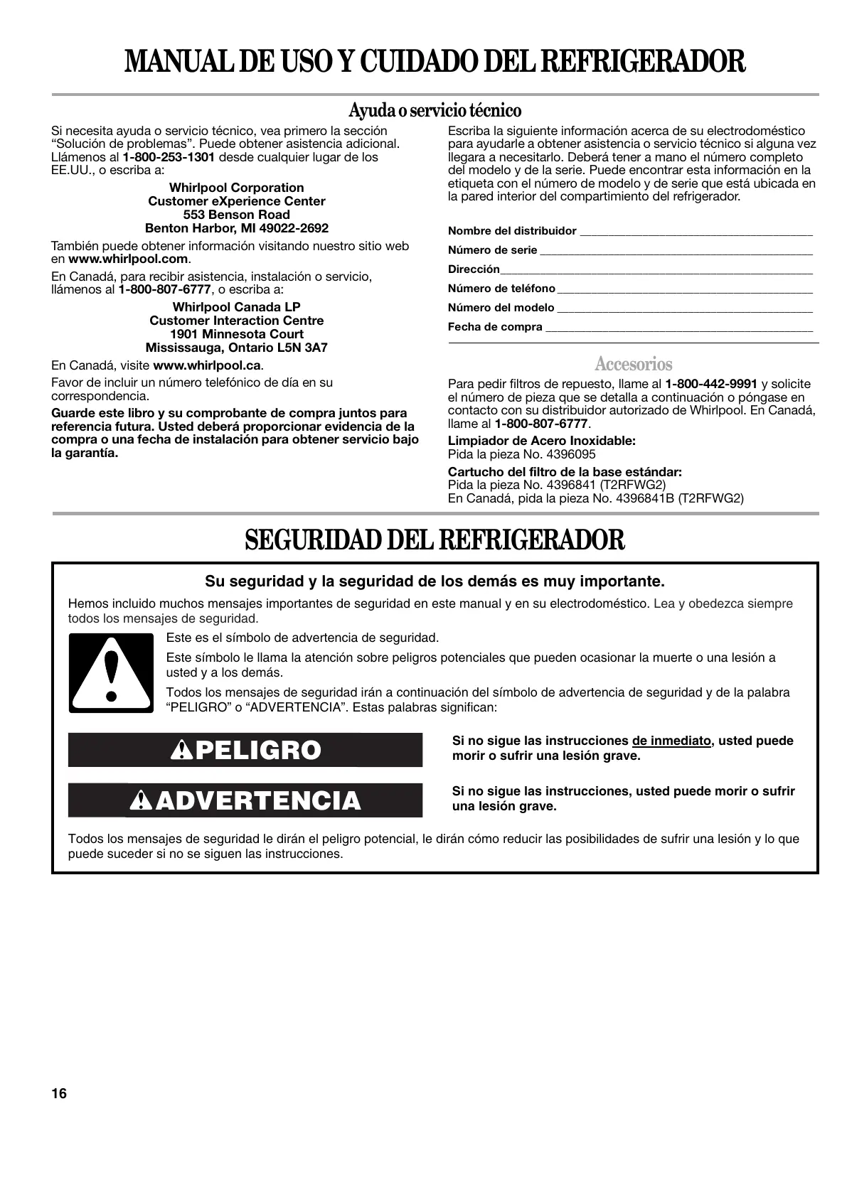 contacto con su distribuidor autorizado de Whirlpool. En Canadá,