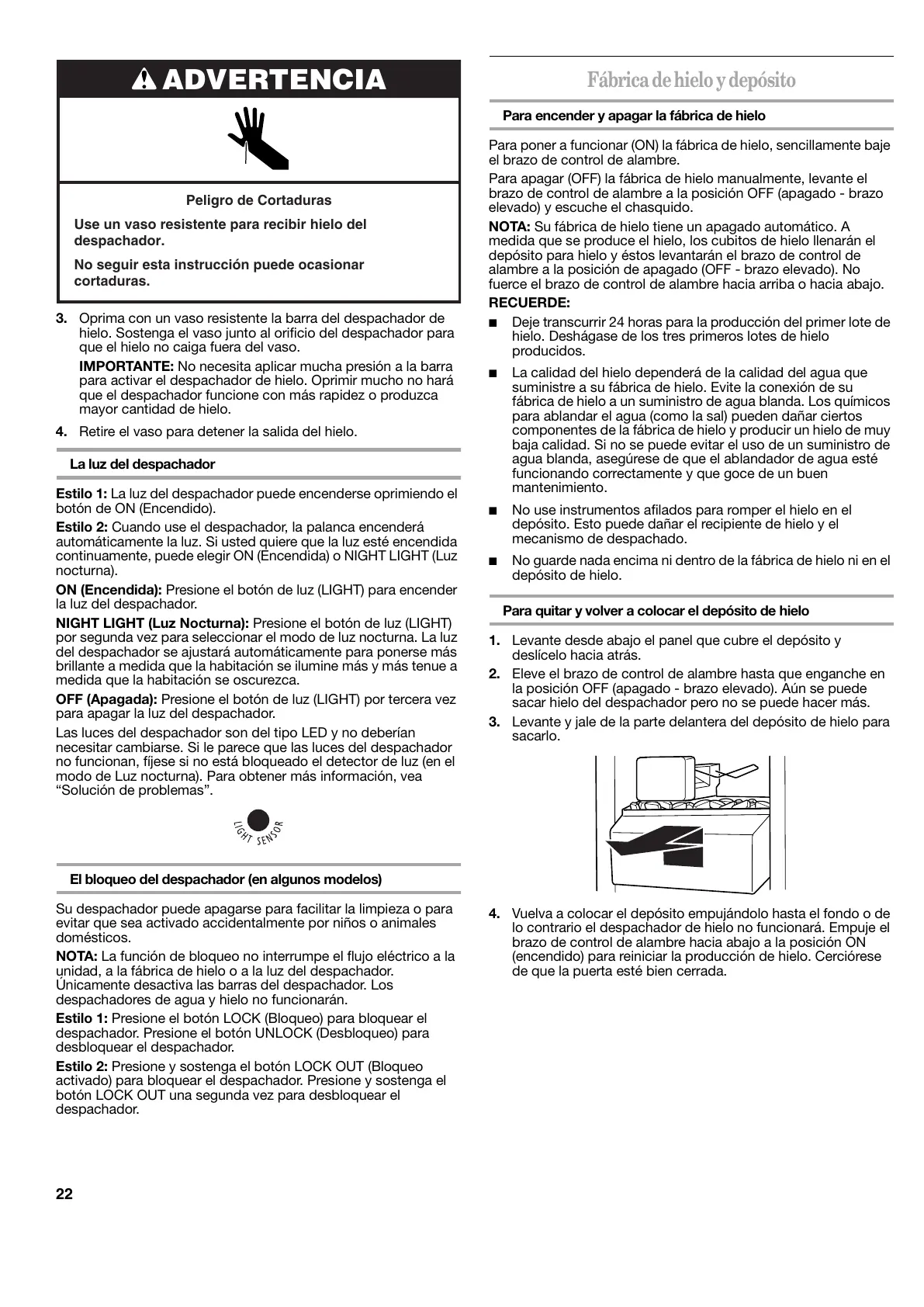 depósito para hielo y éstos levantarán el brazo de control de