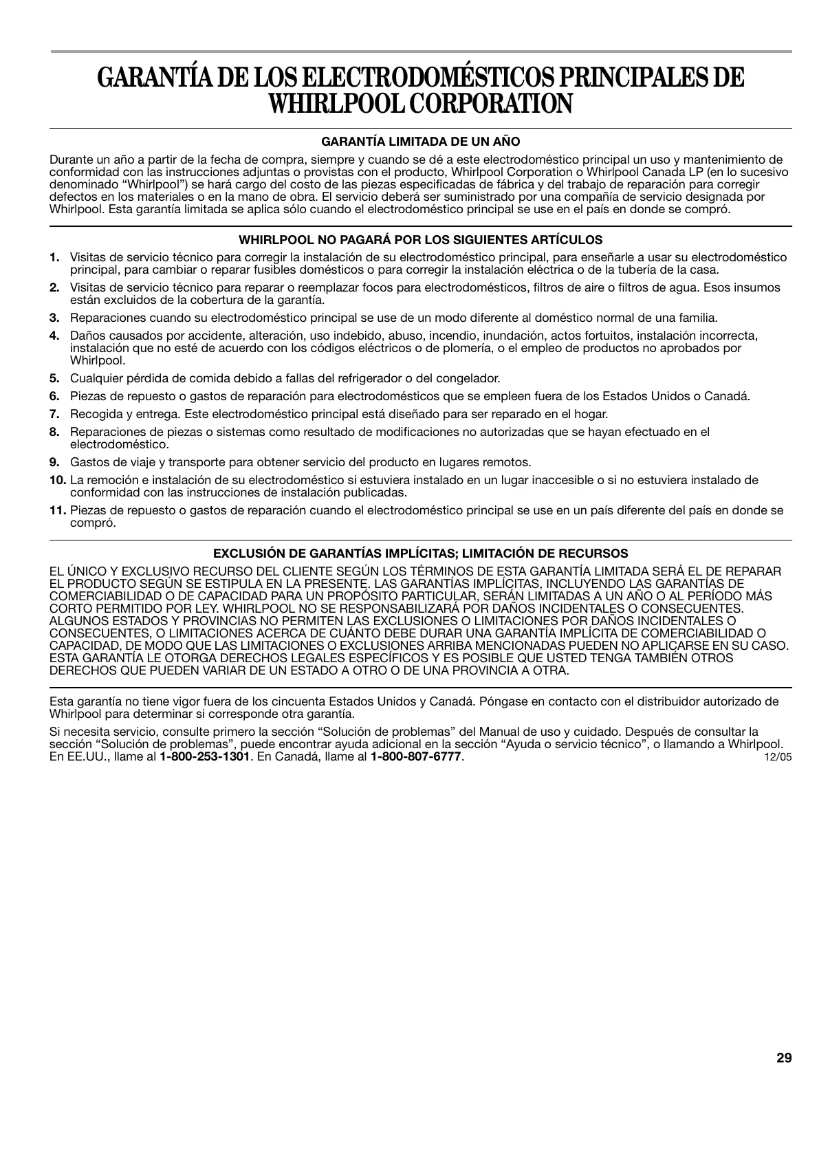 Whirlpool. Esta garantía limitada se aplica sólo cuando el electrodoméstico principal se use en el país en donde se compró.