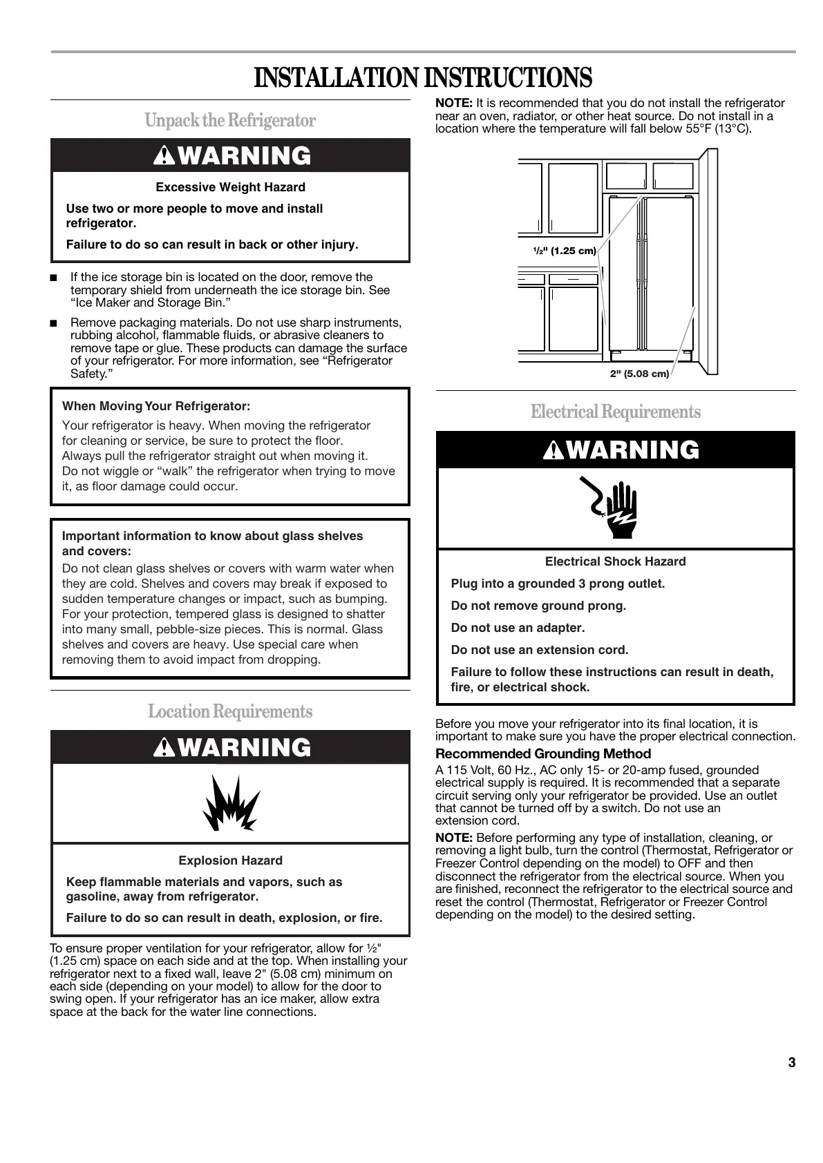 refrigerator next to a fixed wall, leave 2" (5.08 cm) minimum on