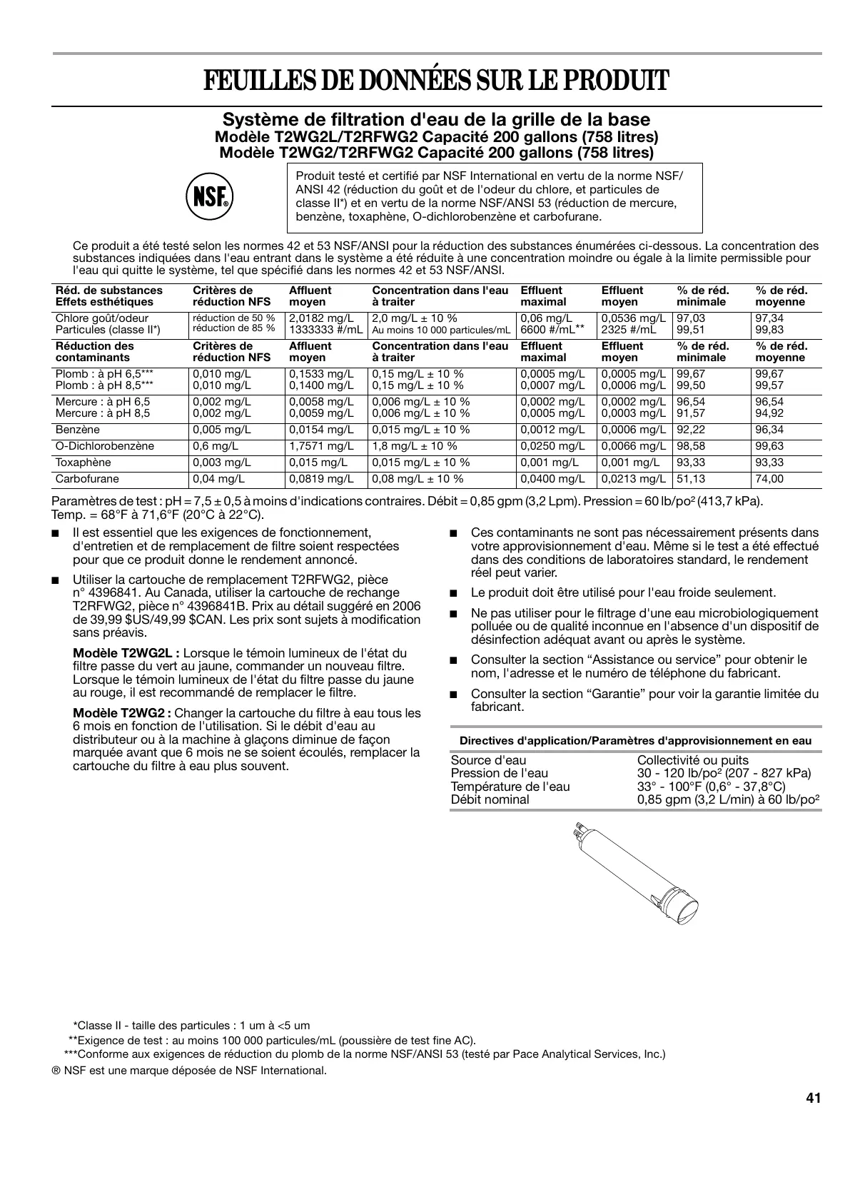 Paramètres de test : pH = 7,5 ± 0,5 à moins d'indications contraires. Débit = 0,85 gpm (3,2 Lpm). Pression = 60 lb/po² (413,7 kPa).
