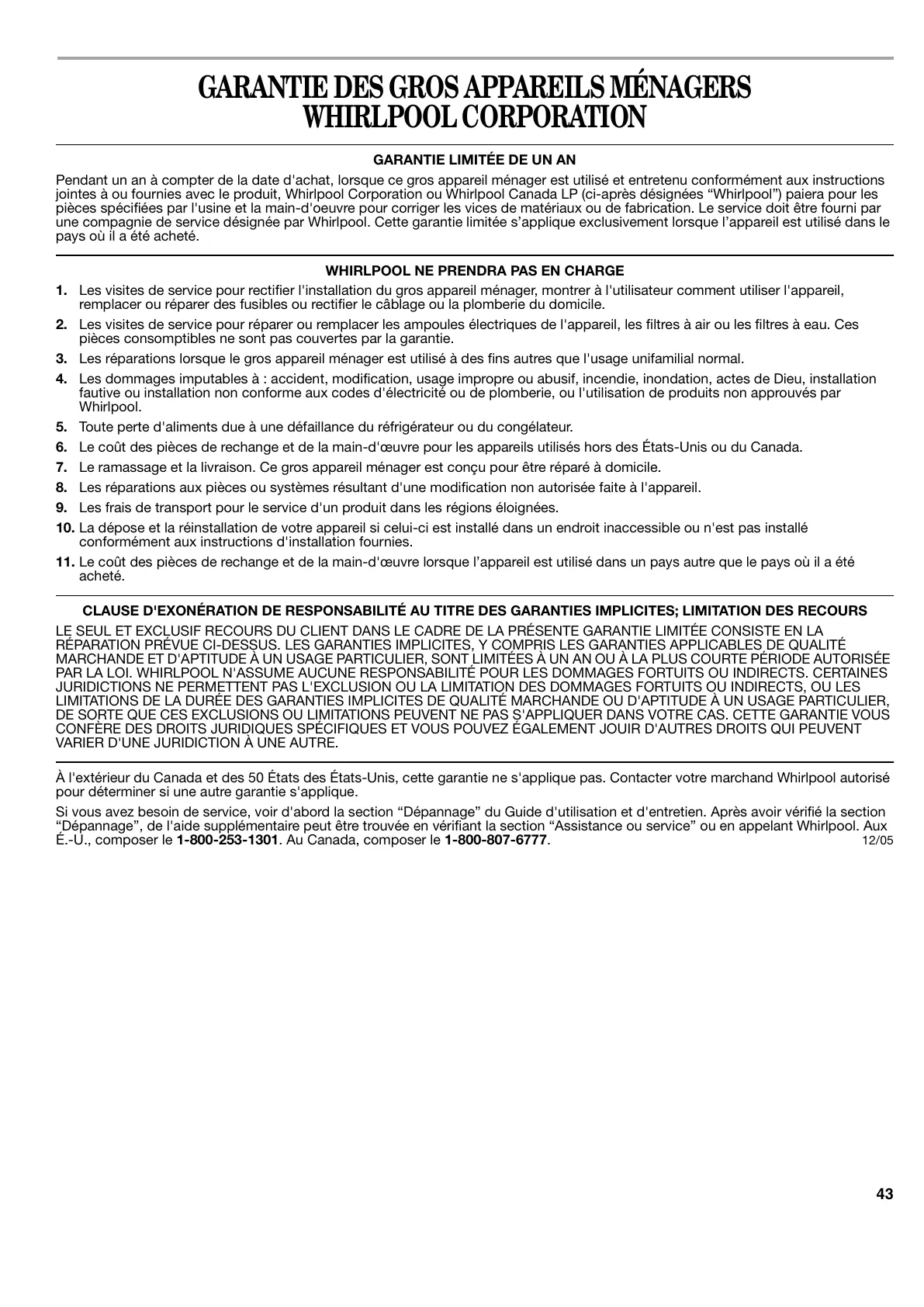 PAR LA LOI. WHIRLPOOL N'ASSUME AUCUNE RESPONSABILITÉ POUR LES DOMMAGES FORTUITS OU INDIRECTS. CERTAINES