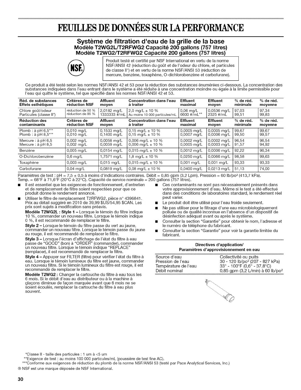 Parametres de test : pH = 7,5 _+0,5 & moins d'indications contraires. Debit = 0,85 gpm (3,2 Lpm). Pression = 60 Ib/po 2(413,7 kPa).