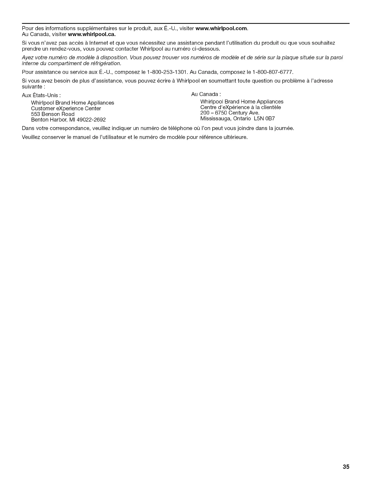 Pour des informations supplementaires sur le produit, aux €:.-U., visiter www.whirlpool.com.
