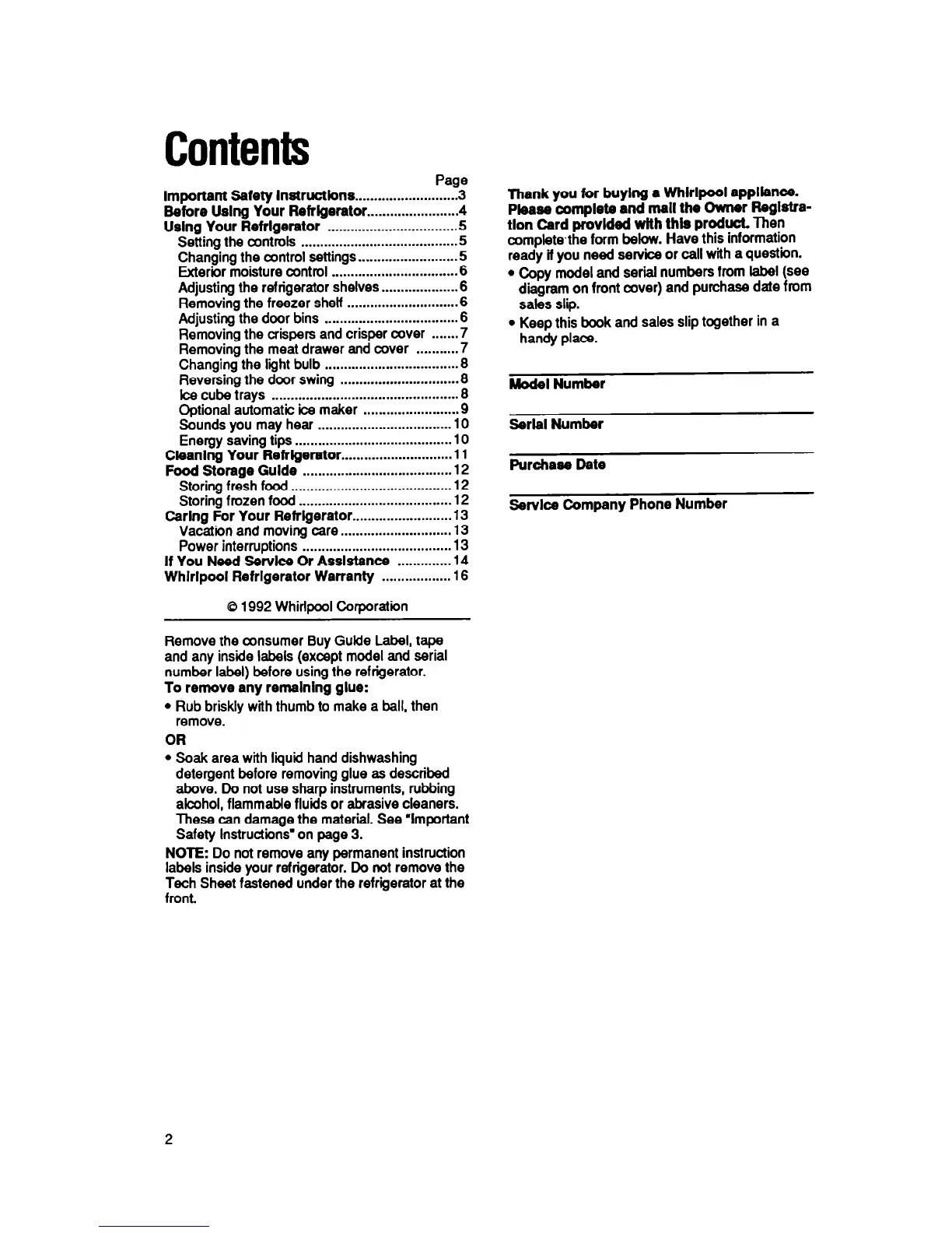 Whlrlpool Refrigerator Warranty ................. .16