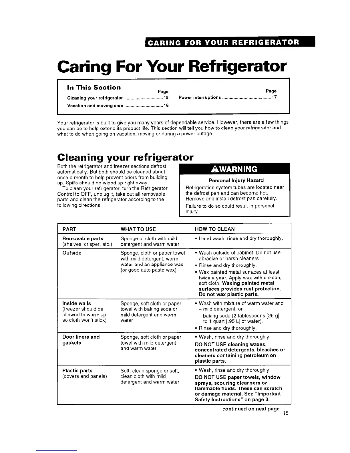 Whirlpool ET20DM - Caring For Your Refrigerator; Cleaning Refrigerator Components