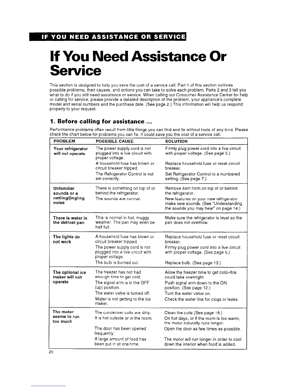 Whirlpool ET20DM - If You Need Assistance Or Service; Troubleshooting Common Refrigerator Problems