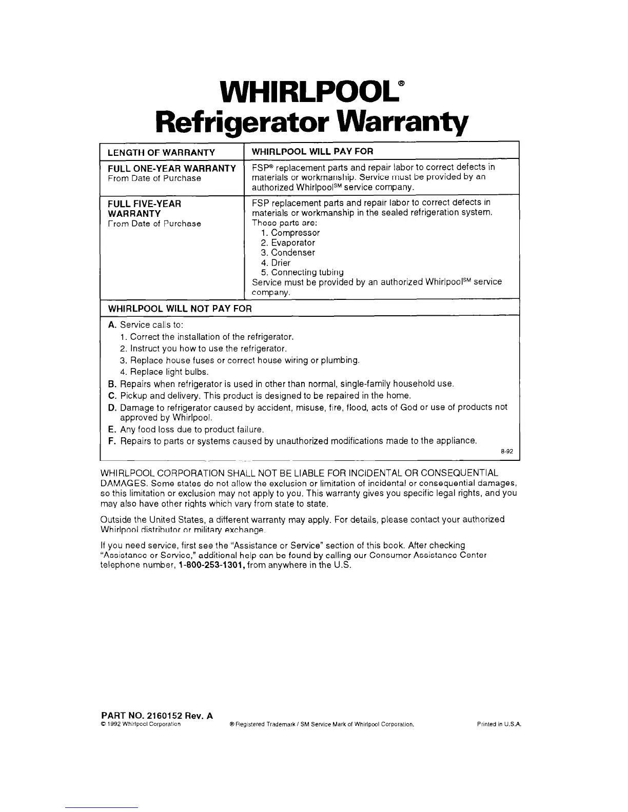 WHIRLPOOL CORPORATION SHALL NOT BE LIABLE FOR INCIDENTAL OR CONSEQUENTIAL