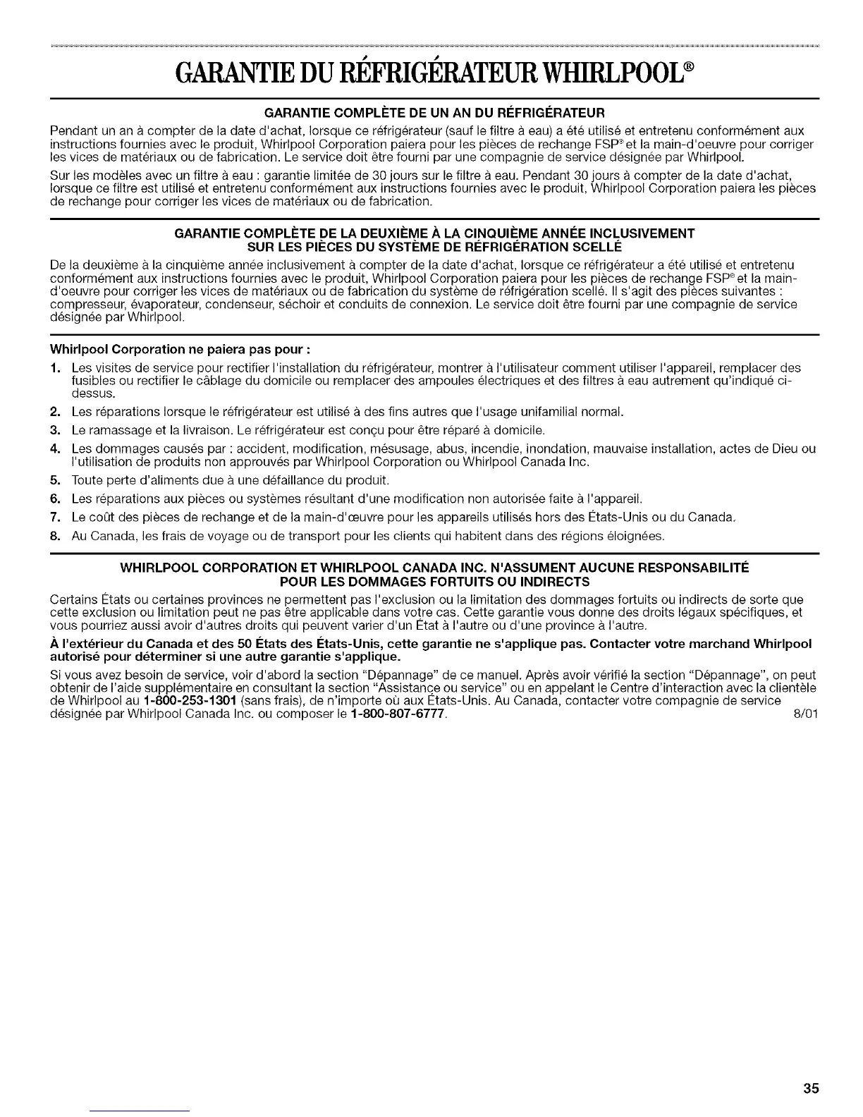 designee par Whirlpool Canada Inc. ou composer le 1-800-807-6777. 8/01