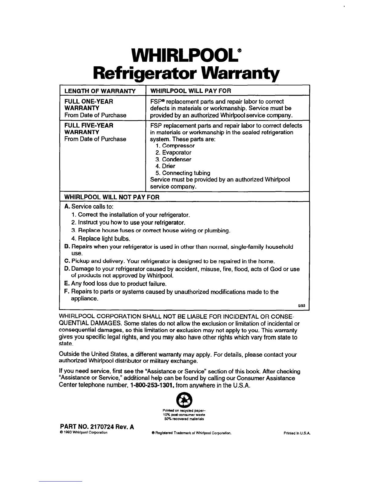WHIRLPOOL CORPORATION SHALL NOT BE LIABLE FOR INCIDENTAL OR CONSE-