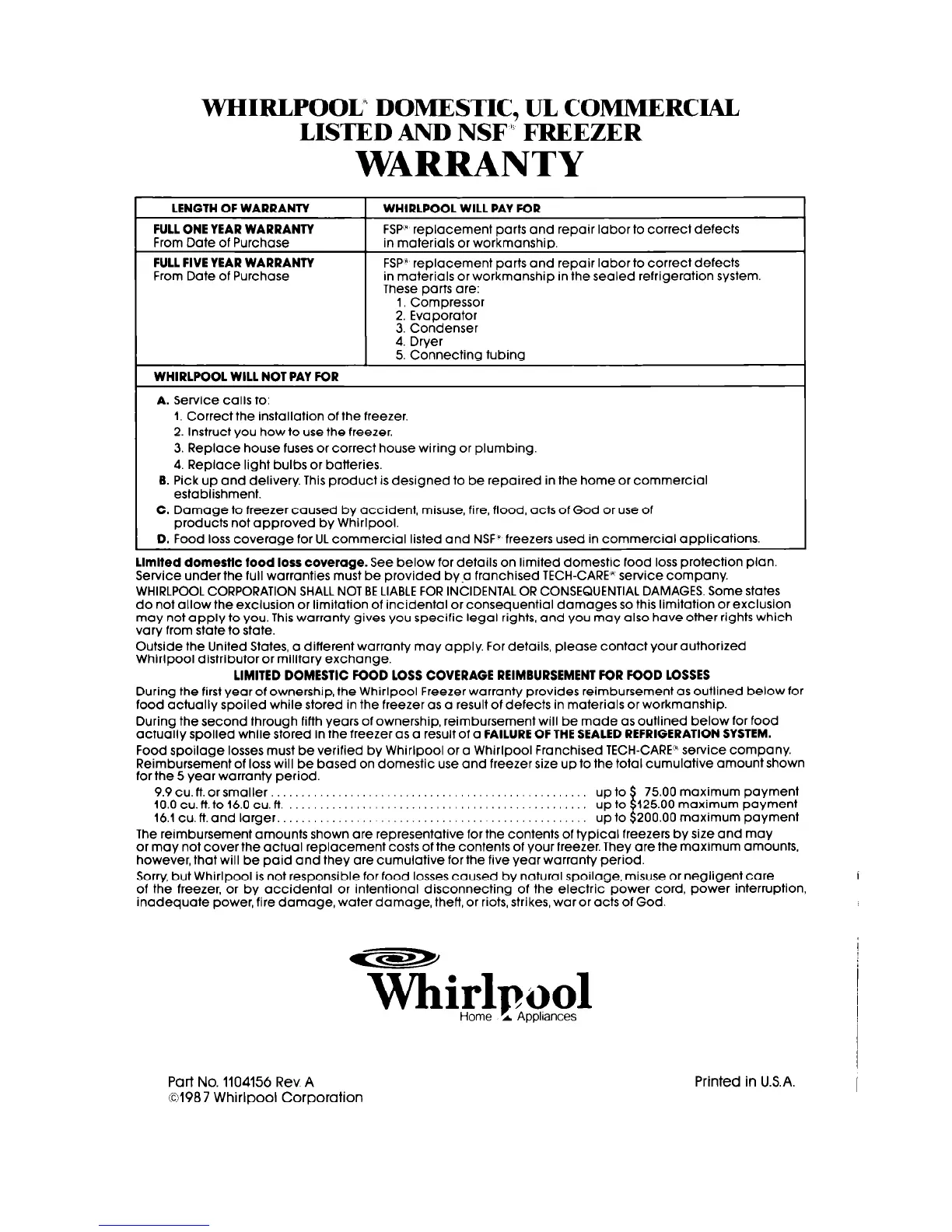 Food spoilage losses must be verified by Whirlpool or a Whirlpool Franchised TECH-CARE” service company.