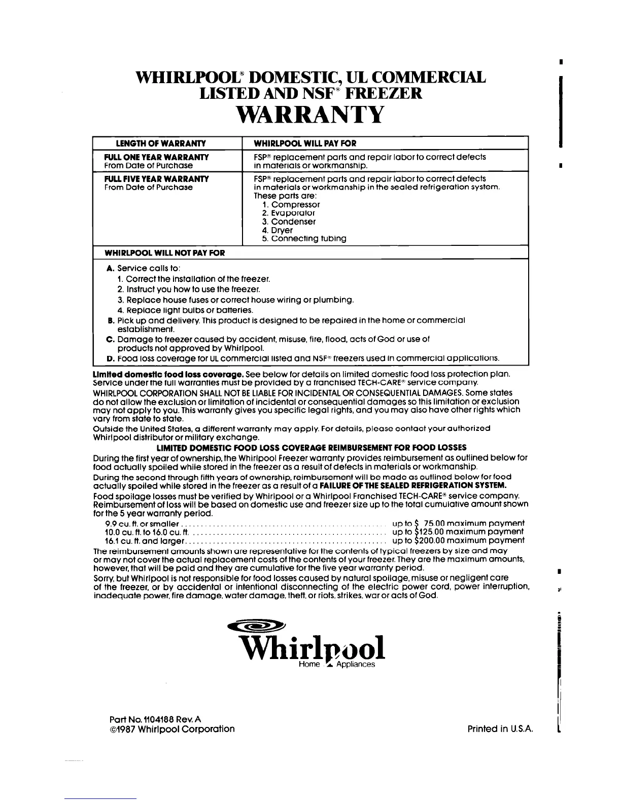 Food spoilage losses must be verified by Whirlpool or a Whirlpool Franchised TECH-CARE@ service company.