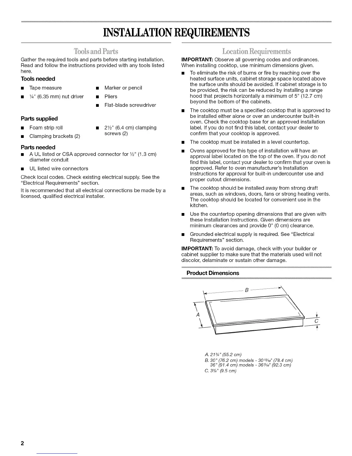 When installing cooktop, use minimum dimensions given.