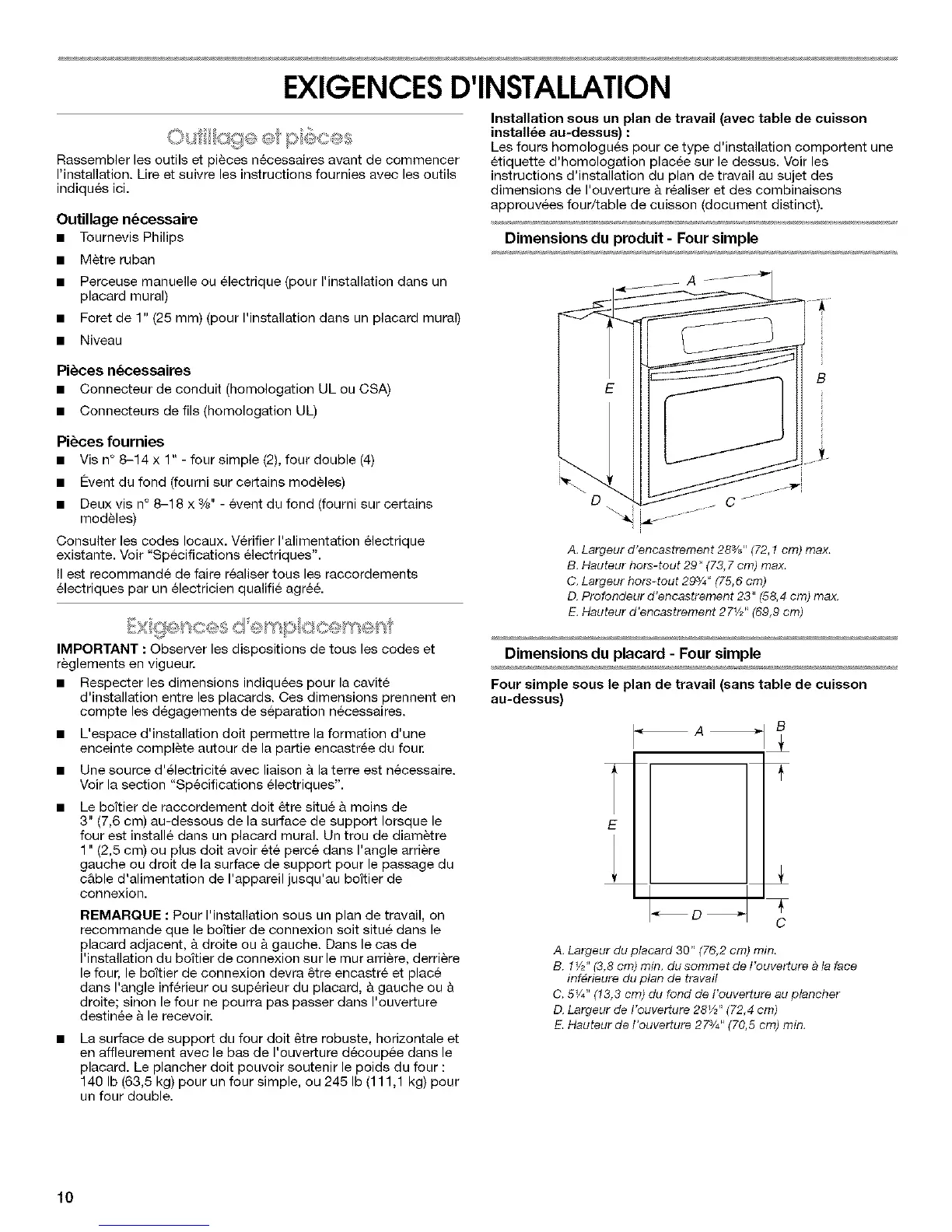 140 Ib (63,5 kg) pour un four simple, ou 245 Ib (111,1 kg) pour