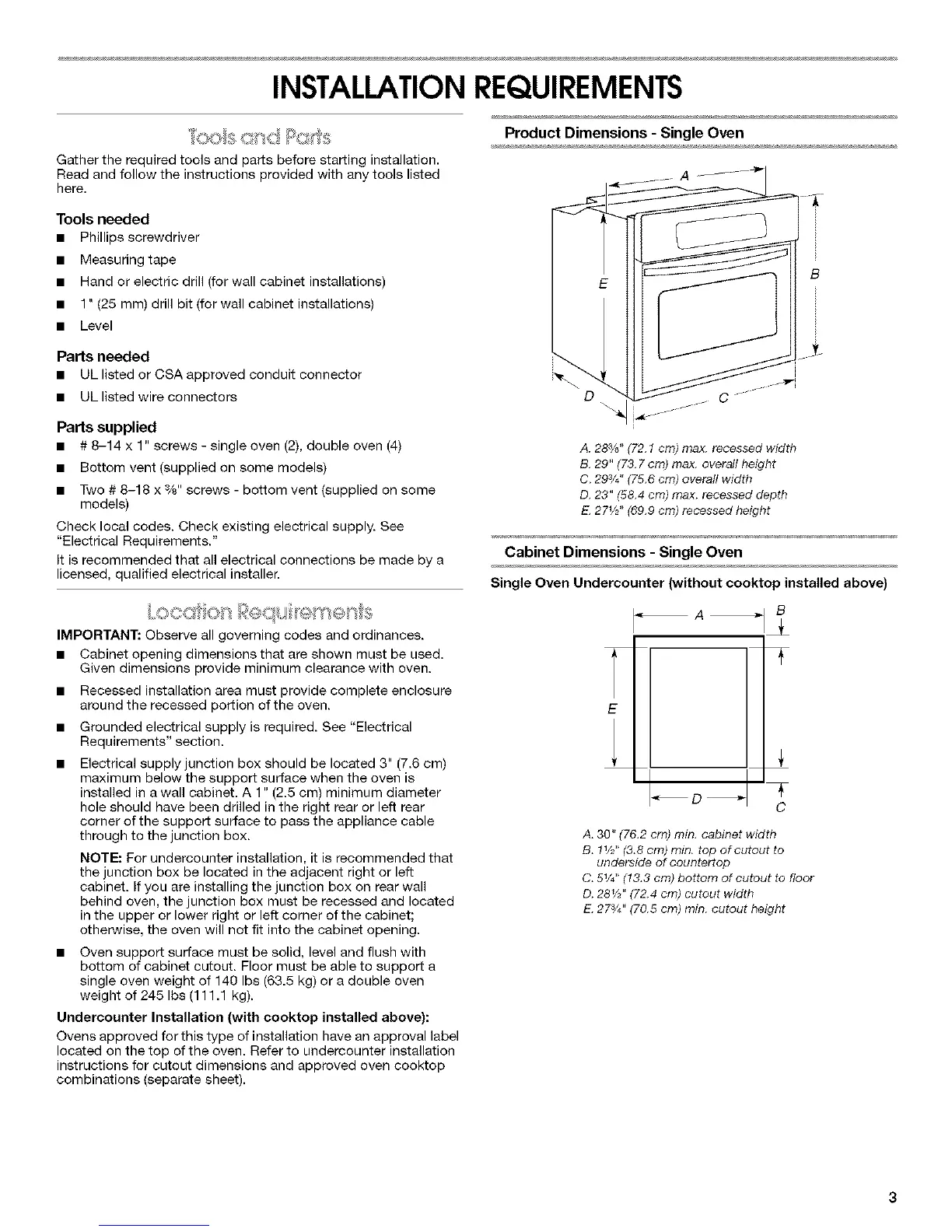 single oven weight of 140 Ibs (63.5 kg) or a double oven