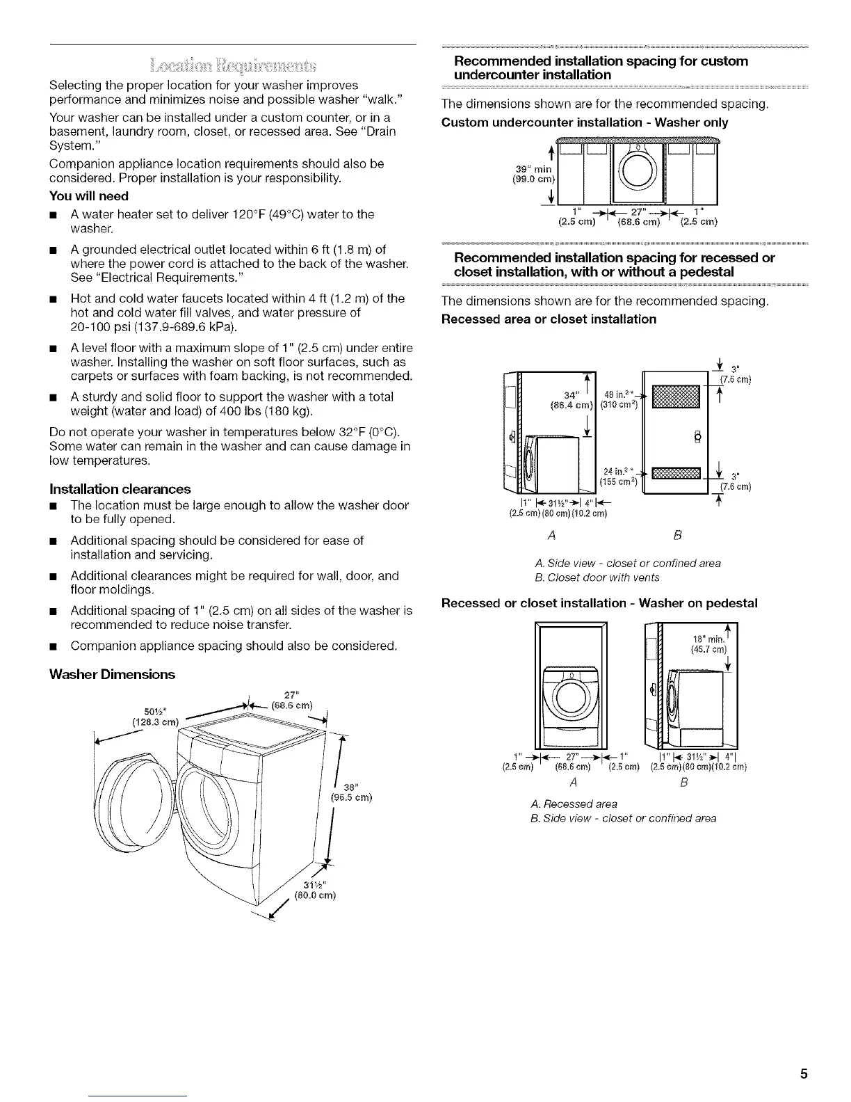 • Additional spacing of 1" (2.5 cm) on all sides of the washer is