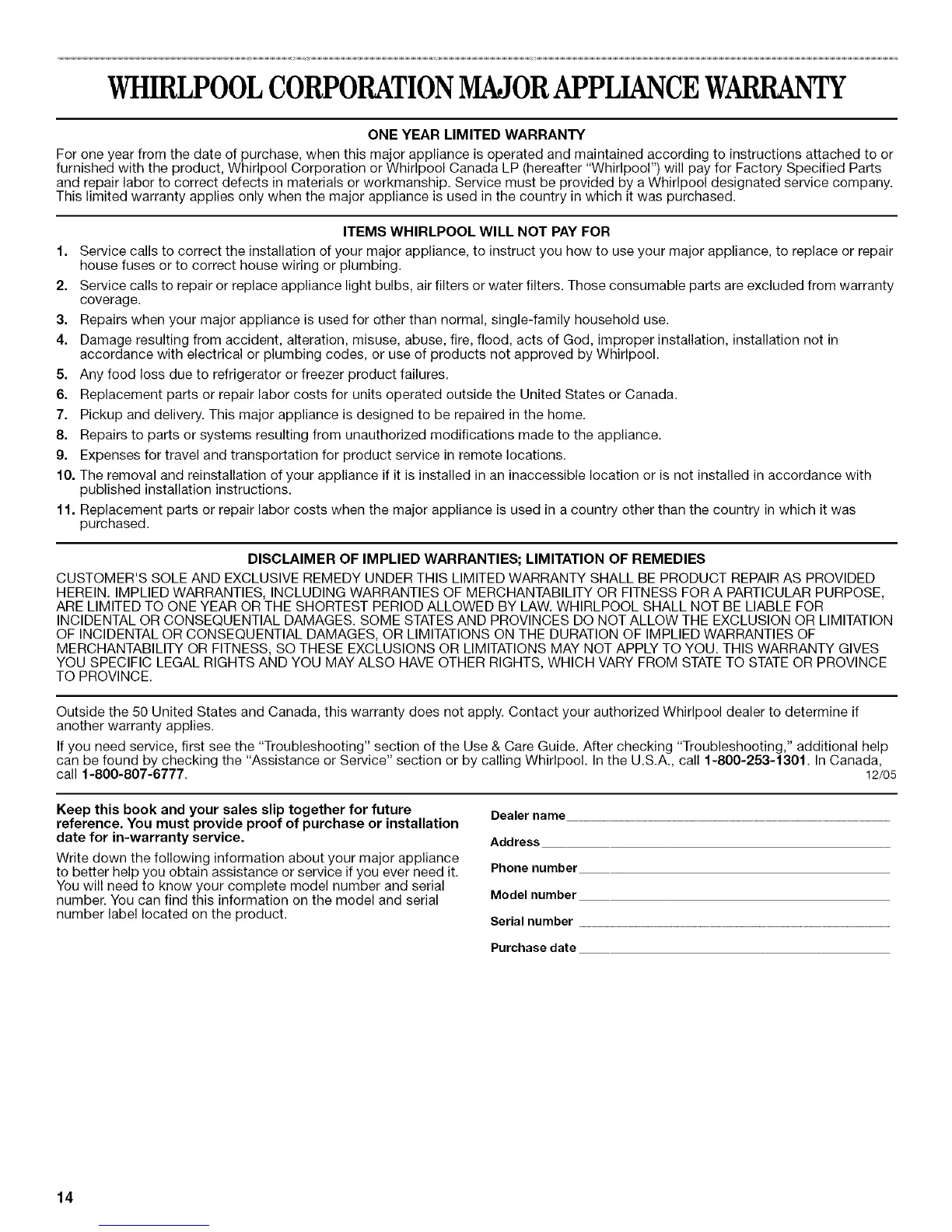 can be found by checking the "Assistance or Service" section or by calling Whirlpool. Inthe U.S.A., call f-800-253-1301. In Canada,