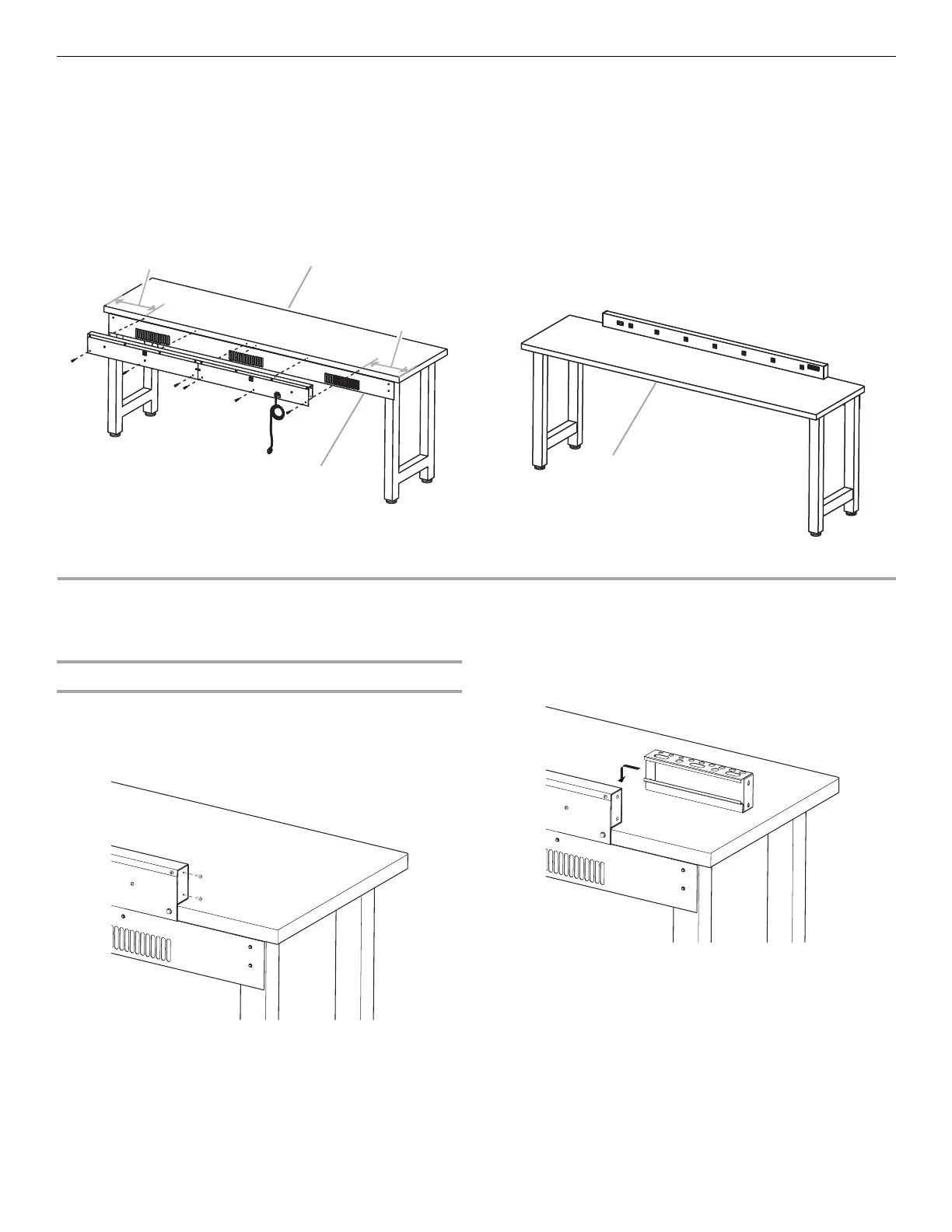 Les porte-outils peuvent être montés sur l'établi de 8 pi (2,4 m) (un porte-outil de chaque côté de la barre multiprise) ou bien sur les panneaux