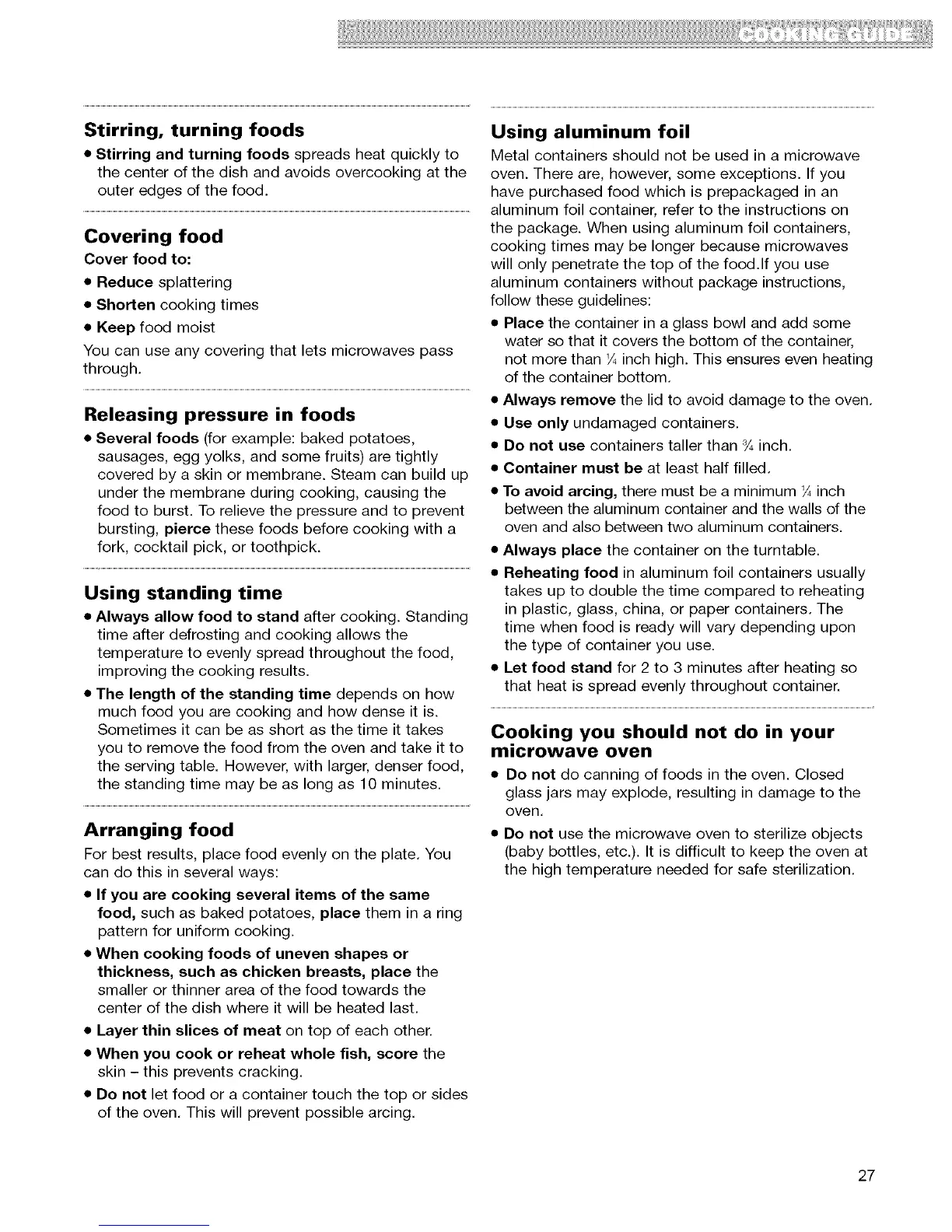 • Stirring and turning foods spreads heat quickly to Metal containers should not be used in a microwave