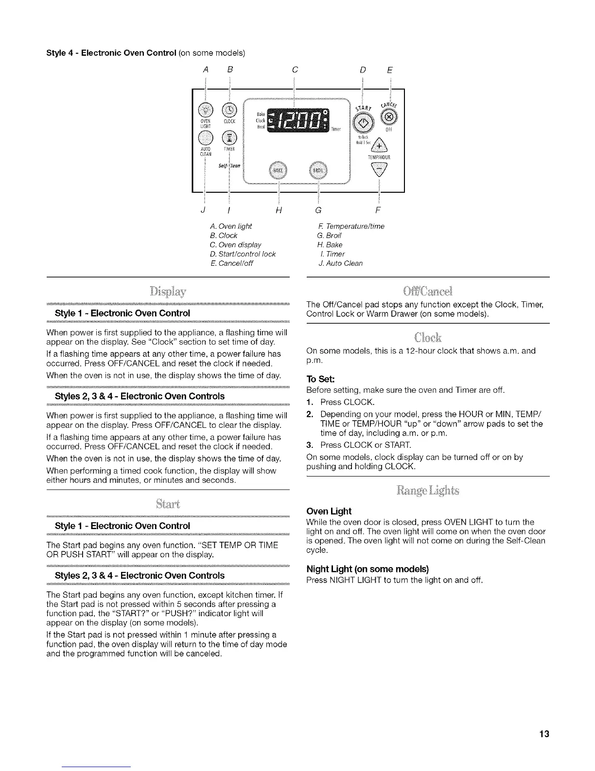 Styles 2, 3 & 4 - Electronic Oven Controls Press NIGHT LIGHT to turn the light on and off.