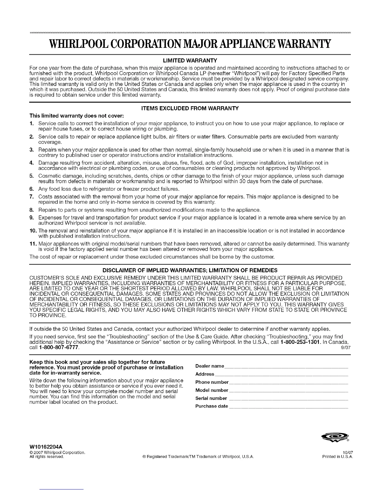 If outside the 50 United States and Canada, contact your authorized Whirlpool dealer to determine if another warranty applies.