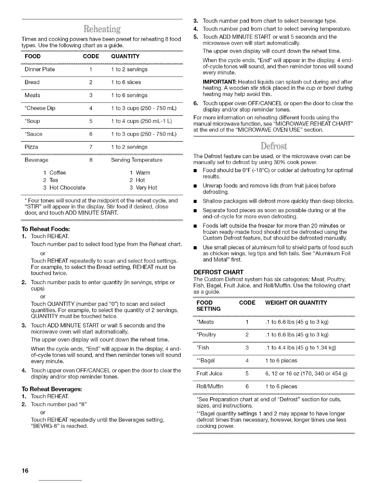 manual microwave function, see "MICROWAVE REHEAT CHART"