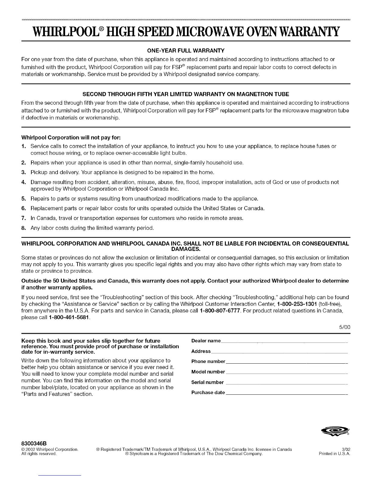 WHIRLPOOL®HIGH SPEED MICROWAVEOVENWARRANTY