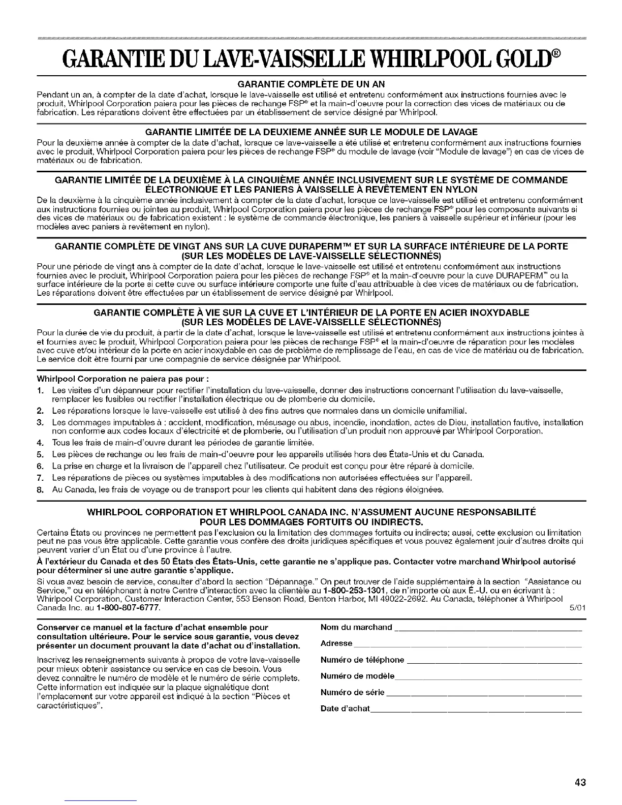 et fournies avec le produit, Whirlpool Corporation paiera pour les pieces de rechange FSP + et la main-d'oeuvre de r6paration pour les modeles