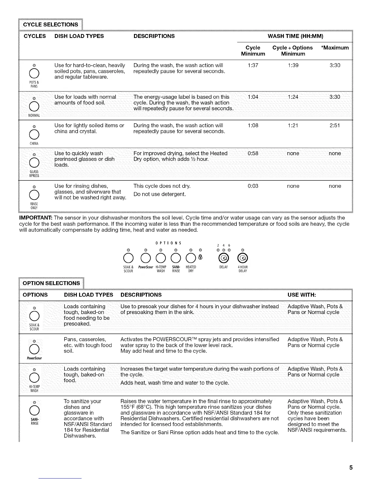 IMPORTANT: The sensor in your dishwasher monitors the soil level. Cycle time and/or water usage can vary as the sensor adjusts the