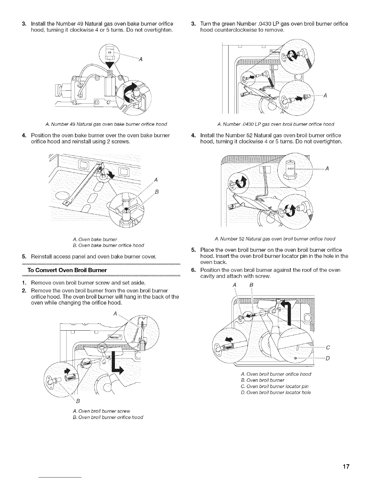 3. Install the Number 49 Natural gas oven bake burner orifice 3. Turn the green Number .0430 LP gas oven broil burner orifice